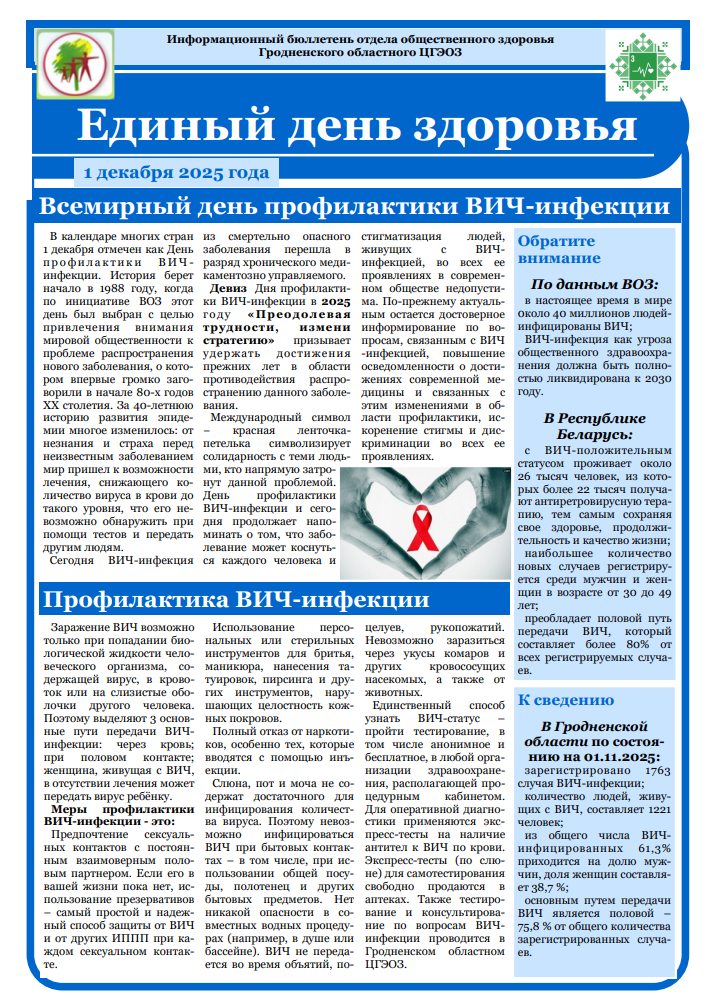Пресс-релиз 2025 День профилактики ВИЧ-инфекции «Преодолевая трудности, измени стратегию» В календаре многих стран 1 декабря отмечен как День профилактики ВИЧ-инфекции. История его берет начало в 1988 году, когда по инициативе Всемирной организации здравоохранения (ВОЗ) этот день был выбран с целью привлечения внимания мировой общественности к проблеме распространения нового заболевания, о котором впервые громко заговорили